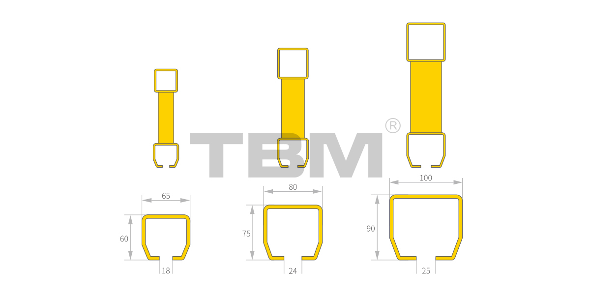 | দ্রষ্টব্য: 60 সিরিজ, 75 সিরিজ, এবং 90 সিরিজ ট্র্যাকের ক্রস-বিভাগীয় উচ্চতা নির্দেশ করে। | ||||